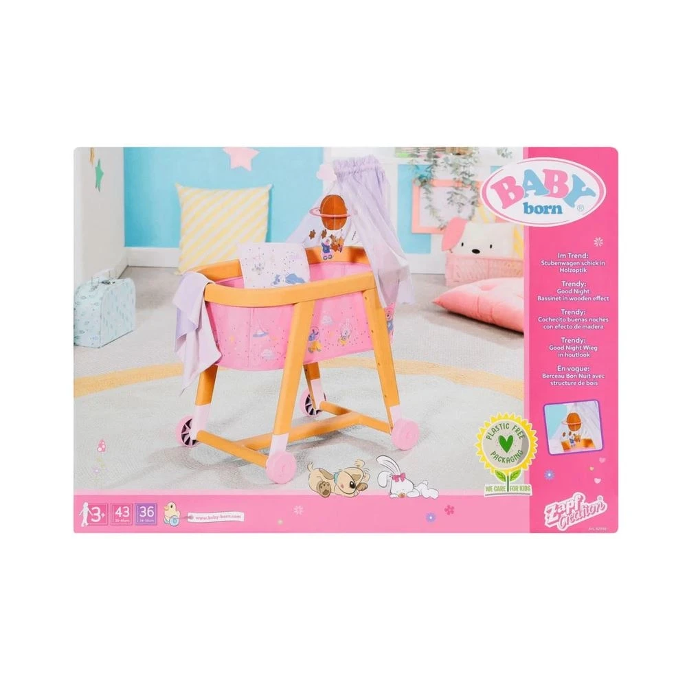 Oyuncak bebeklere iyi uykular! Yeni BABY born beşiği uzay temalı aksesuarıyla bebeğinizin yıldızların altında huzurlu bir şekilde uykuya dalmasına yardımcı oluyor. Tekerlekleri sayesinde kolayca hareket ettirilebilen bu beşik, bebeğinizi her zaman yanıbaşınızda tutabilme imkanı sunuyor. Üstelik ahşap görünümü, kaliteli malzemesi ve şık tasarımıyla bu beşik favoriniz olacak! Üç yaş ve üzeri çocuklar için tasarlanan BABY born Beşiği, yaratıcılığınızı geliştirirken eğlenceli oyun saatleri sunuyor. BABY born beşiği 43 cm bebekler için idealdir. Bebek ve aksesuarlar dahil değildir.