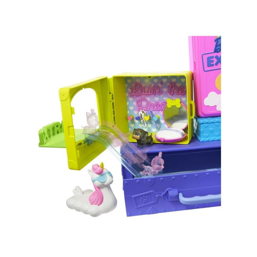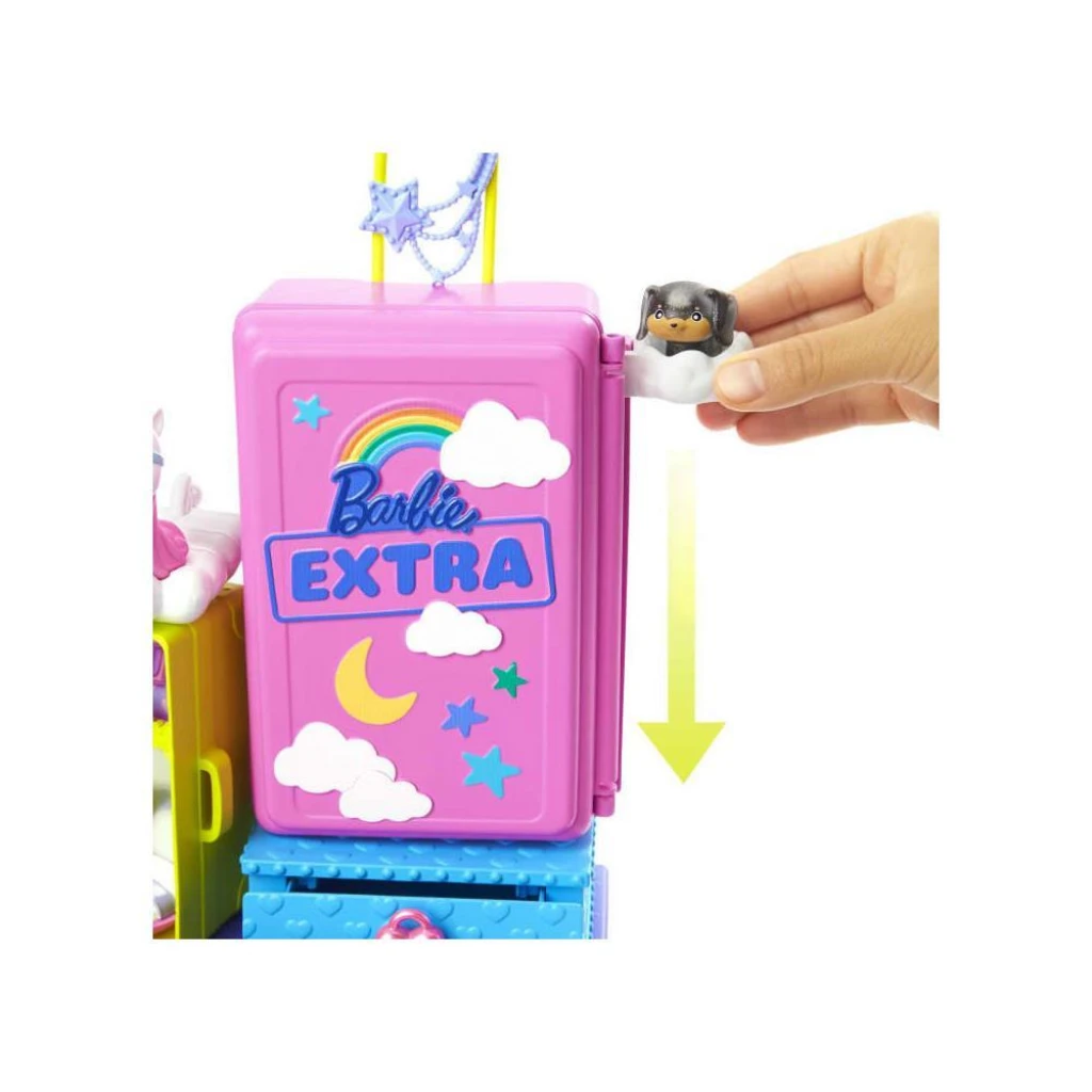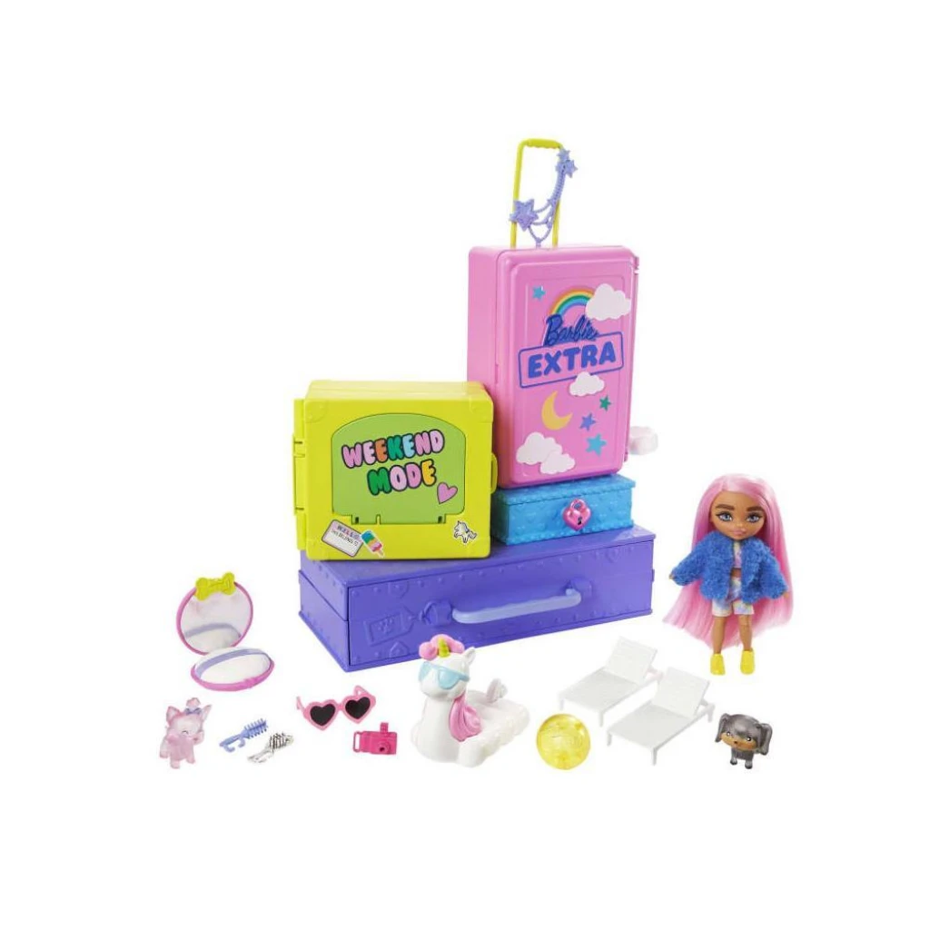 Uzun pembe saçları, batik giysisi, kürk ceketi ve aksesuarlarıyla göz dolduran özel Barbie Extra Mini Bebek ve sevimli 2 yavru köpeğiyle parti eğlencesi başlamak için sizi bekliyor.