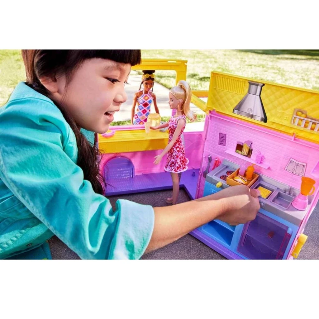 Bu Barbie limonatacı oyun setinde, şehirdeki en lezzetli içecekleri yapmak için Barbie bebeğin hayal edebileceği her şeyi sunan ve hikayeye anlatımına yardımcı olan 25'ten fazla parça bulunur. Bebek dahil değildir. Pembe limonata renk tonundaki bu sevimli araba güneşli günlerde yapılacak gezintiler için özel olarak tasarlandı. Açılır tavan gibi detaylar aracın havasına hava katıyor.
