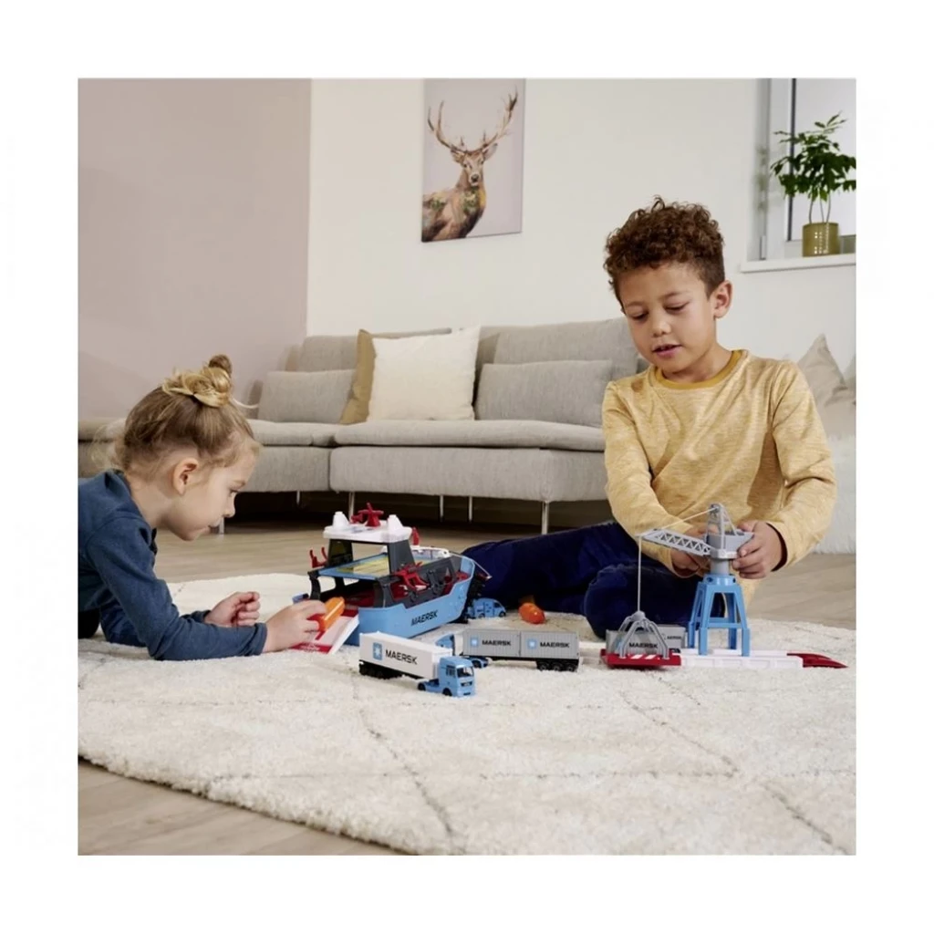 Majorette – Konteyner gemili Creatix oyuncak limanı – 5 yaş ve üzeri çocuklar için kargo gemisi, hareketli vinç ve konteynerli MAN kamyonu ile Maersk lojistik limanı (29x24x5 cm)Maersk konteyner limanına hoş geldiniz!Bu oyuncak seti, bir konteyner limanından tipik sahneleri canlandırmak için kullanılabilecek eğlenceli özelliklerle doludur. Manuel bir vinç ile gemiye yüklenebilen, çıkarılabilir konteynerli bir kamyon ile birlikte gelir. Gemi, yükleme ve boşaltmayı sağlamak için katlanabilir bir üst güverteye ve arka rampaya sahiptir. Dahası, bir helikopter iniş pisti bile var!Resmi lisanslı Maersk oyuncağı (45x29x24 cm), gemi, vinç ve oyuncak kamyonla birlikte:1. Yüzen tekne• Kancalı kablolu vinç • Konteynerler ve arabalar için yükleme alanı • Eğme fonksiyonlu n2 kurtarma botu • Katlanabilir ön ve arka rampa• Manevra kabiliyeti yüksek üst güverte• Helikopter iniş pisti2. Liman yükleme istasyonu:• Oyuncak arabalar ve kamyonlar için parça • Kablo vinçli döner vinç • Majorette Creatix istasyonları ile uyumlu3. 20 ft konteynırlı döküm MAN TGX:• Metal• Dönen tekerlekler• Hareketli ve açılan parçalar