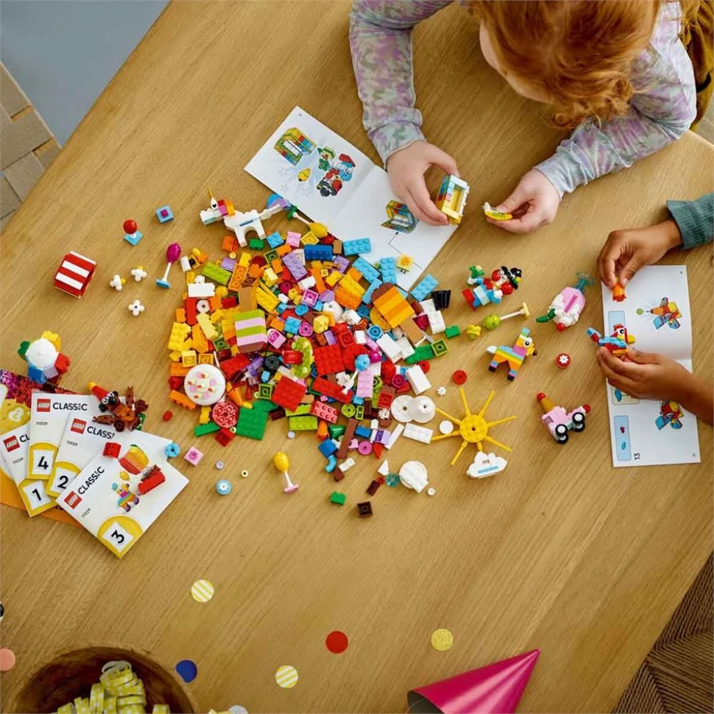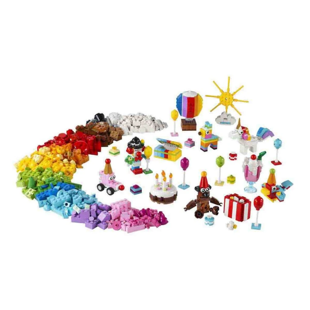 900 parçalı eğlence kutusuyla birlikte inşa edin! Bu renkli yapım parçaları koleksiyonuyla yaratıcı eğlenceyi paylaşın. Parçalar, yapımı kolay 2 model inşa etmek için her biri yapım parçaları ve kolay anlaşılır baskılı yapım talimatlarını içeren 6 poşette gruplandırılmıştır. Modeller arasında oyuncak ayı, palyaço, tek boynuzlu at, pinyata, gökkuşağı, kek, patlamış mısır, balonlar ve küçük hediyeler bulunur. Bu set, herhangi bir kutlama için harika bir grup etkinliğidir ve etkinlik sona erdiğinde yaratıcı yapım deneyimi sona ermez! Setin yapım talimatlarının dijital versiyonuna da LEGO Builder uygulamasından ulaşabilirsiniz.