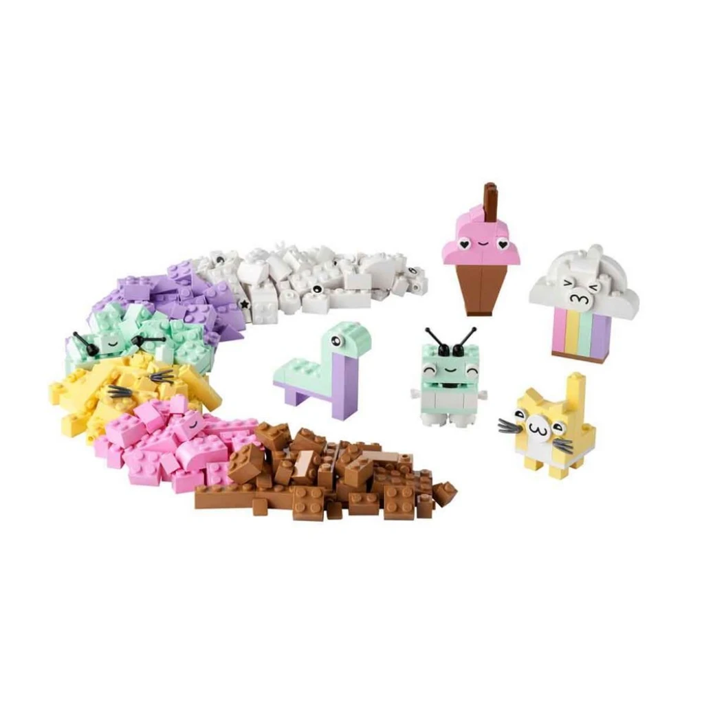 Pastel seçmeli yaratıcı oyunlar; Bu yaratıcı yapım seti, çeşitli şekillerde, boyutlarda ve pastel renklerde 333 yapım parçası içerir. Yapım parçalarından 18'i, çocukların modellerini canlandırmak için kullanabilecekleri ifadeli gözlere sahiptir. Bulut, dondurma, dinozor, kedi ve robot olmak üzere 5 yapımı kolay model için kolay anlaşılır basılı yapım talimatları dahildir. Yaratıcı öz güvenleri geliştikçe çocuklar, sınırsız serbest yapım eğlencesini keşfedebilir. Setin yapım talimatlarının dijital versiyonuna LEGO Builder uygulamasından da ulaşılabilir.