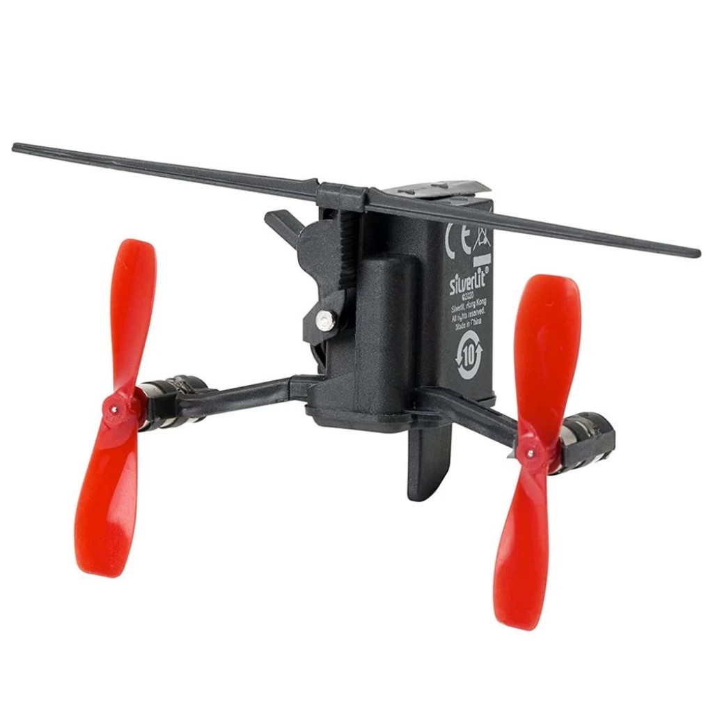 • Kutunun içerisinde; 1 adet önceden katlanmış kağıt uçak, 4 adet ekstra kağıt uçak, 1 adet uçan modül, 1 adet uzaktan kumanda, 1 adet stant, 2 adet yedek pervane, 1 adet USB şarj edilebilir kablo, 1 rotor değişimi için alet ve 1 kullanma kılavuzu bulunmaktadır.